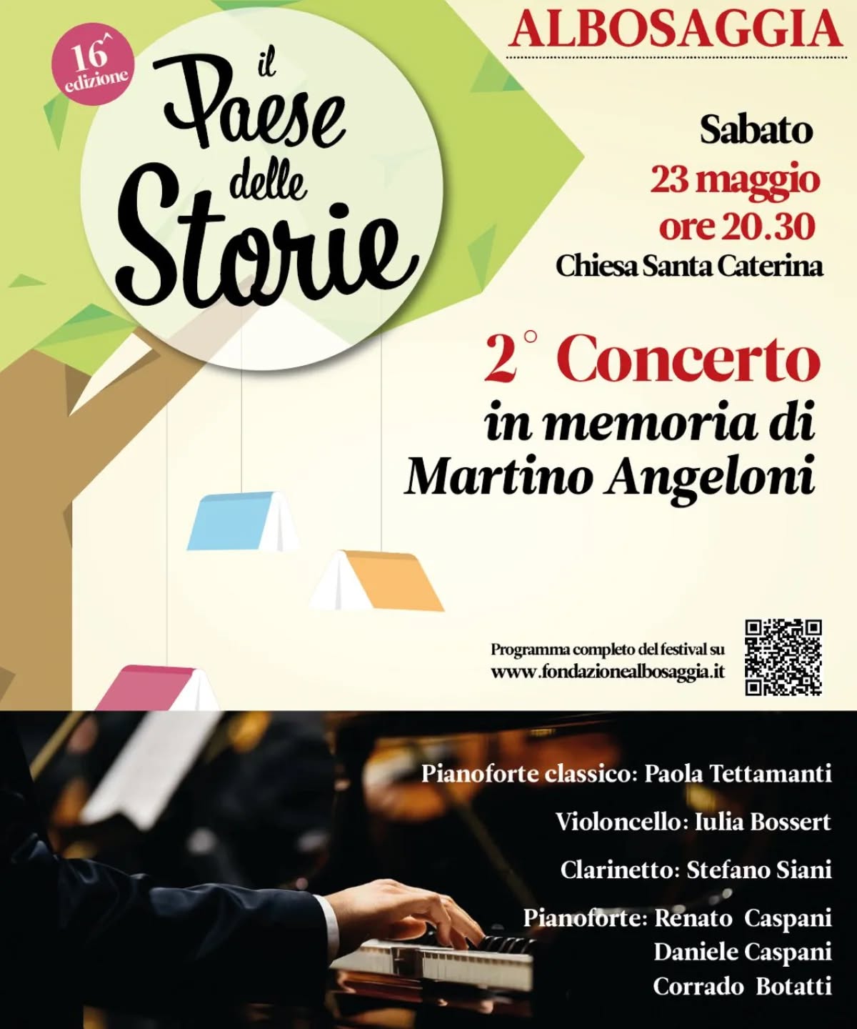 Ogni storia ha la sua colonna sonora...in occasione della 16ª edizione del festival "Il Paese delle Storie", un evento dove la musica classica diventa il linguaggio per onorare la memoria e celebrare la bellezza della comunità di Albosaggia. Un dialogo tra pianoforti, violoncello e clarinetto tra le mura della suggestiva Chiesa di Santa Caterina.