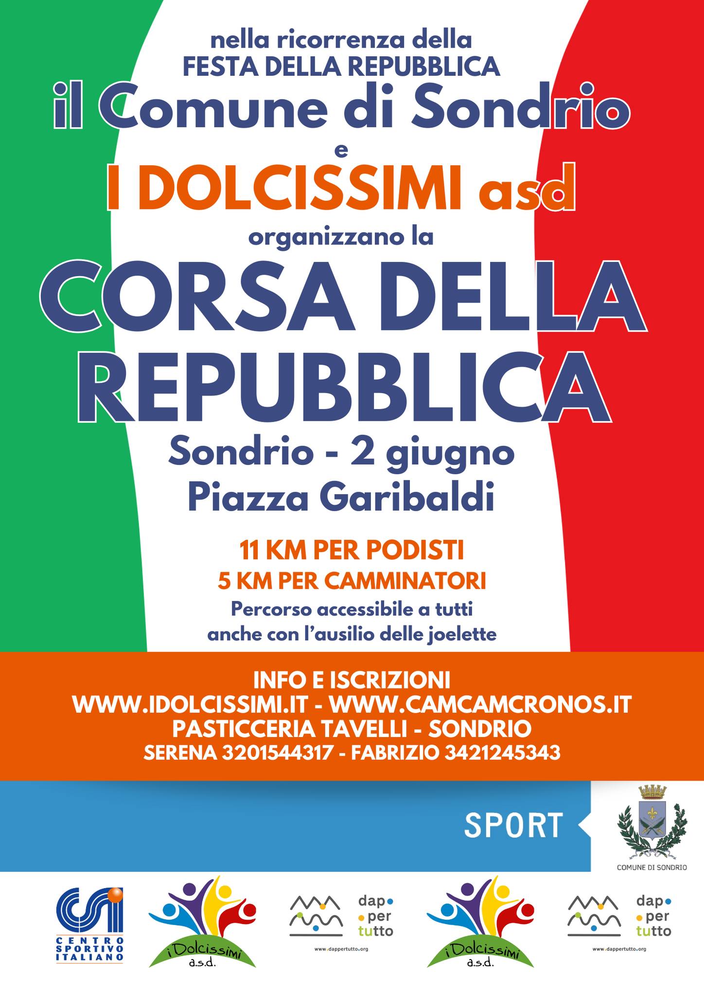 2 GIUGNO - Nella ricorrenza della Festa della Repubblica, il Comune di Sondrio e ASD I Dolcissimi organizzano, con l'obiettivo della promozione dell'attività sportiva e dell'integrazione sociale, la “Corsa della Repubblica”, manifestazione podistica amatoriale non competitiva ad andatura libera e con joelette di 11 Km e 5 km.