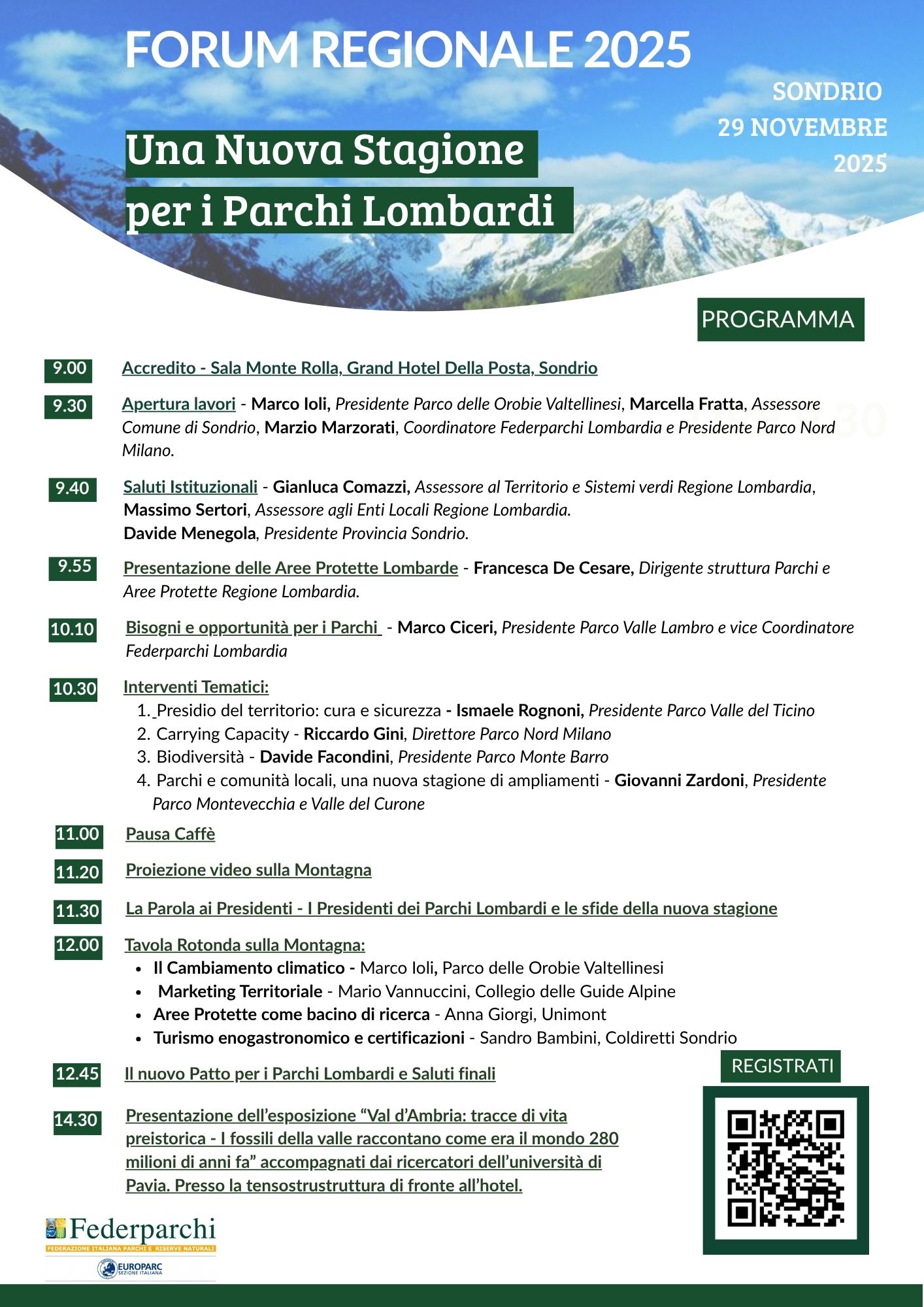 durante il secondo fine settimana del Sondrio Festival, l’occasione per affrontare una nuova stagione per i Parchi lombardi con relatori di spessore e una tavola rotonda su temi quali la cura e la sicurezza del territorio, la biodiversità, il cambiamento climatico, le aree protette come laboratorio privilegiato per la ricerca scientifica e la sperimentazione. (in allegato il programma della giornata)