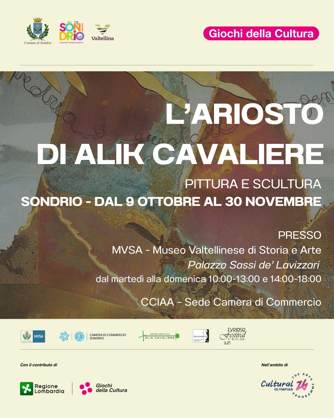 In collaborazione tra il MVSA - Sondrio, la Camera di Commercio di Sondrio, l’ Ass.Bradamande ODV e il centro Artistico Alik Cavaliere di Milano, questa mostra si inserisce tra le attività del Furioso Festival 2025 in Valtellina e nell'ambito delle Olimpiadi della Cultura 26.