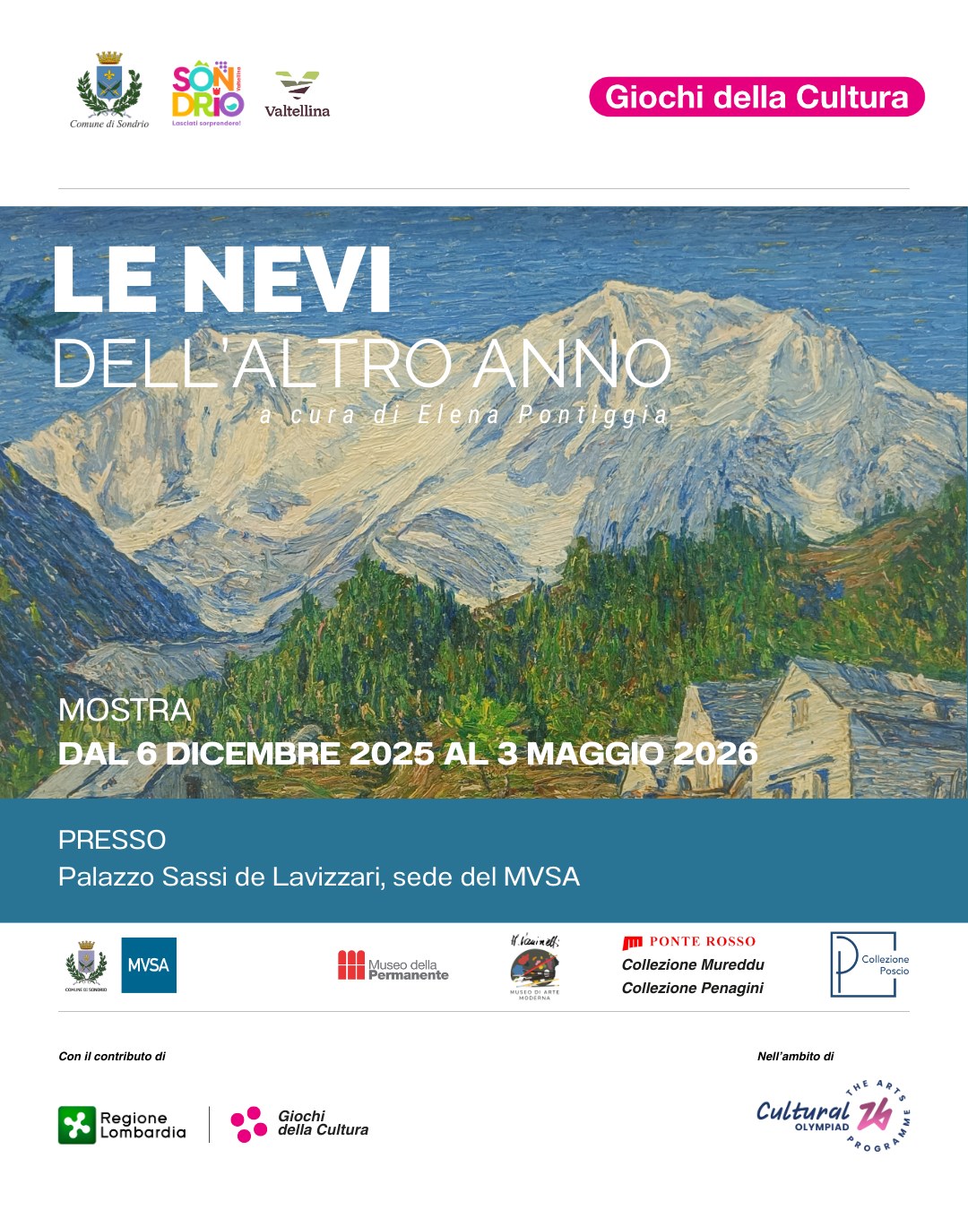 sarà aperta al pubblico la mostra “Le nevi dell’altro anno” , a cura di Elena Pontiggia, promossa dal Comune di Sondrio che si inserisce nelle varie attività del " Bando Olimpiadi della Cultura – La Montagna in Scena a Sondrio " e rientra nel programma delle Olimpiadi della Cultura 2026.
