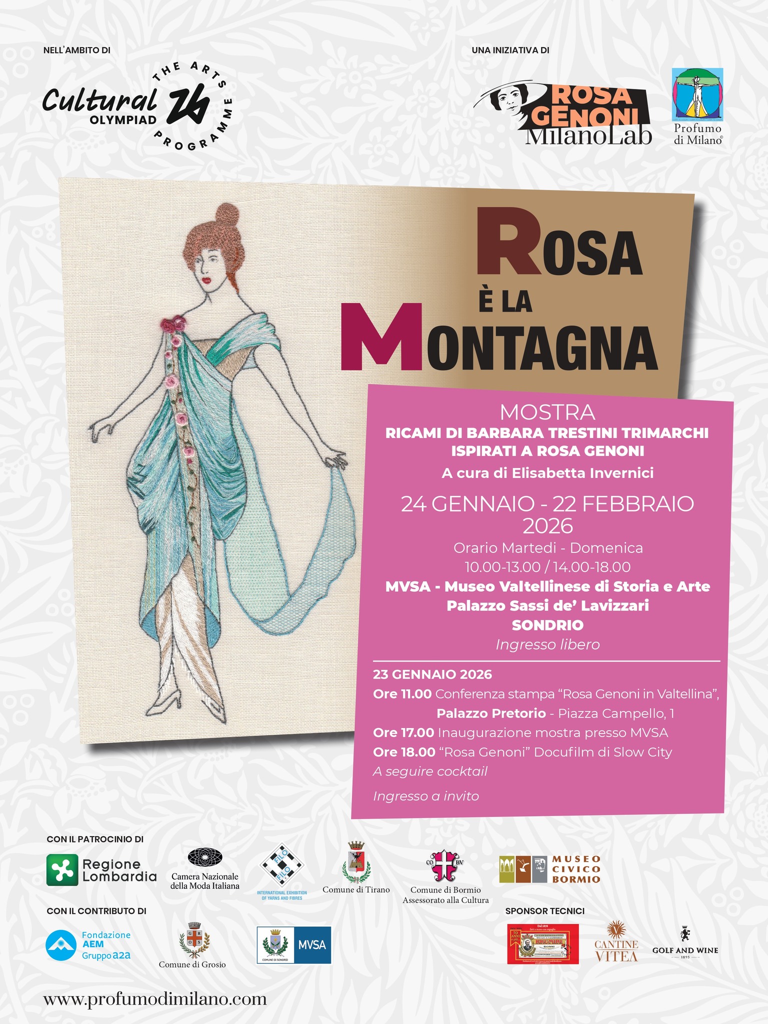 L’esposizione presenta una selezione di ricami ad ago di Barbara Trestini Trimarchi, ispirati ai bozzetti disegnati da Rosa Genoni nel 1933, affiancati da abiti e accessori originali della Belle Époque. Un percorso suggestivo, arricchito da un tappeto olfattivo al profumo di rosa, rende omaggio alla grande stilista tiranese e al suo dialogo con l’alta moda europea del primo Novecento.